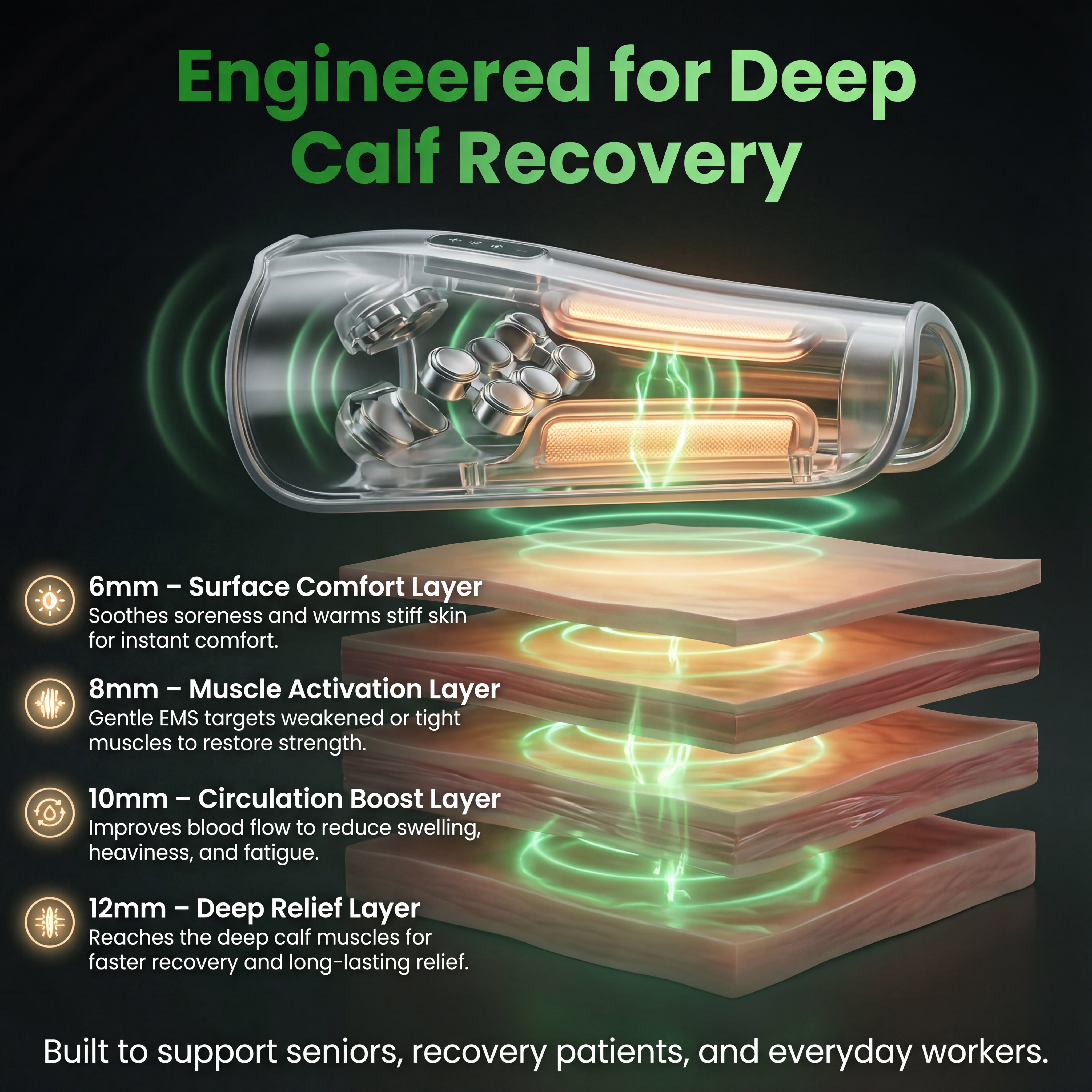 It gently activates your calf muscles, helping ease stiffness and bring a natural feeling of lightness, great for recovery, post-workout use, or days when you've been seated too long.